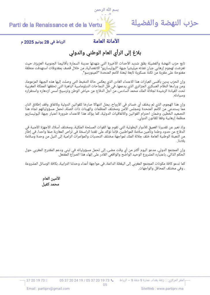 أعرب حزب النهضة والفضيلة عن قلقه الشديد إزاء ما وصفه بـ”الهجوم الإرهابي” الذي استهدف مدينة السمارة جنوب المملكة، والذي نُسب إلى عناصر من جبهة “البوليساريو” الانفصالية. وأكد الحزب أن القصف، الذي استهدف منطقة عسكرية مفتوحة قرب ثكنة تابعة لبعثة الأمم المتحدة “المينورسو”، يشكل تصعيدًا خطيرًا وخرقًا سافرًا للقانون الدولي واتفاق وقف إطلاق النار.