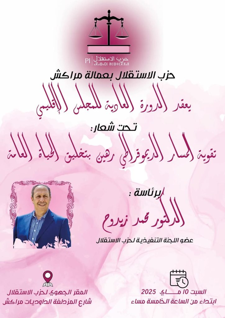 انطلقت، مساء السبت، أشغال الدورة العادية لمجلس حزب الاستقلال بعمالة مراكش، وذلك بالمقر الجهوي للحزب الكائن بشارع المزدلفة بمنطقة الداوديات، وسط أجواء تنظيمية تعكس حيوية العمل الحزبي محلياً.