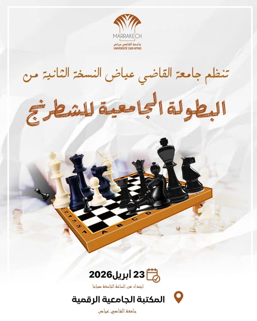 تستعد جامعة القاضي عياض بمراكش لإعطاء انطلاقة النسخة الثانية من البطولة الجامعية للشطرنج، يوم الخميس 23 أبريل 2026 برحاب المكتبة الجامعية الرقمية.