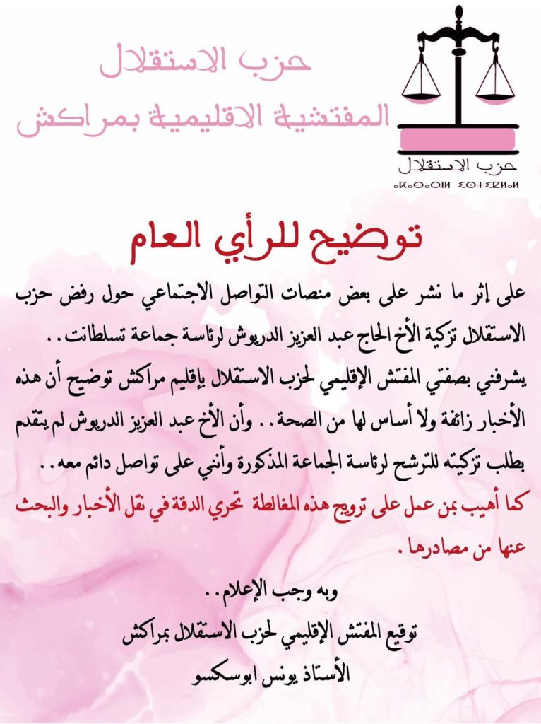 خرج حزب الاستقلال، عبر مفتشيته الإقليمية بمراكش، بتوضيح رسمي للرأي العام، بخصوص ما تم تداوله مؤخراً على منصات التواصل الاجتماعي، حول رفض الحزب تزكية عبد العزيز الدرويش للترشح لرئاسة جماعة تسلطانت.