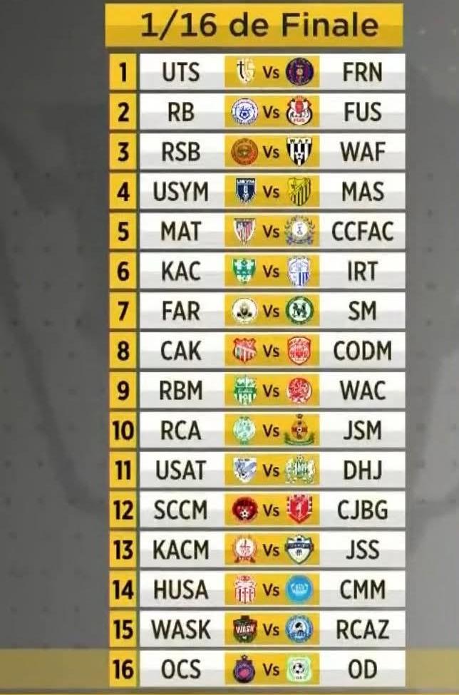 وفي مواجهات إضافية، يلتقي المتأهل من النادي القنيطري واتحاد طنجة مع الفائز من نهضة بركان والوداد الفاسي، بينما يجمع لقاء آخر بين المتأهل من الكوكب المراكشي وشباب السوالم مع الفائز من الرشاد البرنوصي والفتح الرباطي.